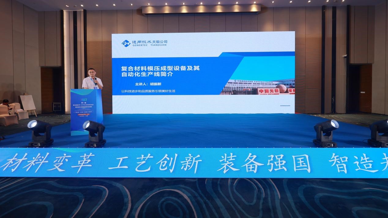 通用技術機床公司市場管理部總經(jīng)理蘇曉川,天鍛公司黨委副書記、總經(jīng)理劉林志,副總經(jīng)理劉玉民、副總經(jīng)理王世明、行業(yè)專家康連順等領導專家出席會議,天鍛公司設計院復合材料所所長胡振新作了題為“復合材料模壓成型設備及其自動化生產(chǎn)線簡介”的報告。