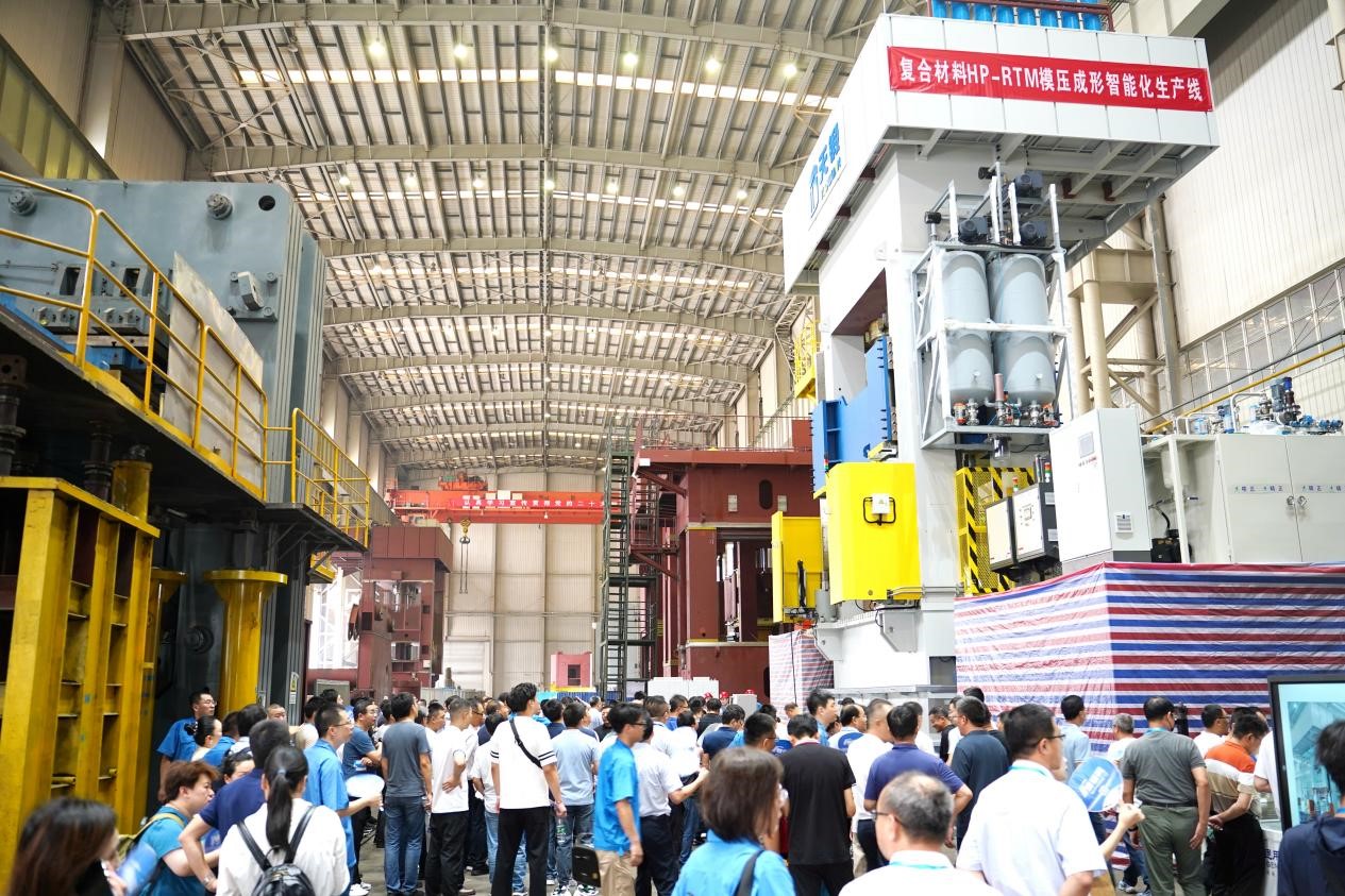 大會期間,嘉賓們參觀了天鍛公司工廠,詳細了解了天鍛公司生產(chǎn)的HP-RTM復合材料壓機模壓生產(chǎn)線,觀看了自動化生產(chǎn)線模型演示畫面,該產(chǎn)線可用于生產(chǎn)碳纖維或玻璃纖維為基材的各類產(chǎn)品,包括新能源汽車電池盒上蓋。通過參觀嘉賓們對公司近年來復合材料產(chǎn)品的性能和技術進步情況有了全面了解。