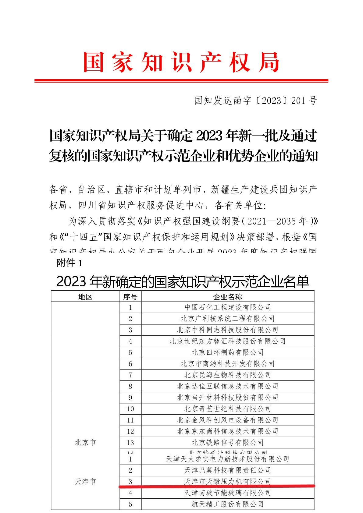 近日,國(guó)家知識(shí)產(chǎn)權(quán)局發(fā)布《國(guó)家知識(shí)產(chǎn)權(quán)局關(guān)于確定 2023 年新一批及通過(guò)復(fù)核的國(guó)家知識(shí)產(chǎn)權(quán)示范企業(yè)和優(yōu)勢(shì)企業(yè)的通知》。經(jīng)企業(yè)申報(bào)、天津市知識(shí)產(chǎn)權(quán)局推薦、國(guó)家知識(shí)產(chǎn)權(quán)局批準(zhǔn),天鍛公司成功入選2023年新確定的國(guó)家知識(shí)產(chǎn)權(quán)示范企業(yè)名單。