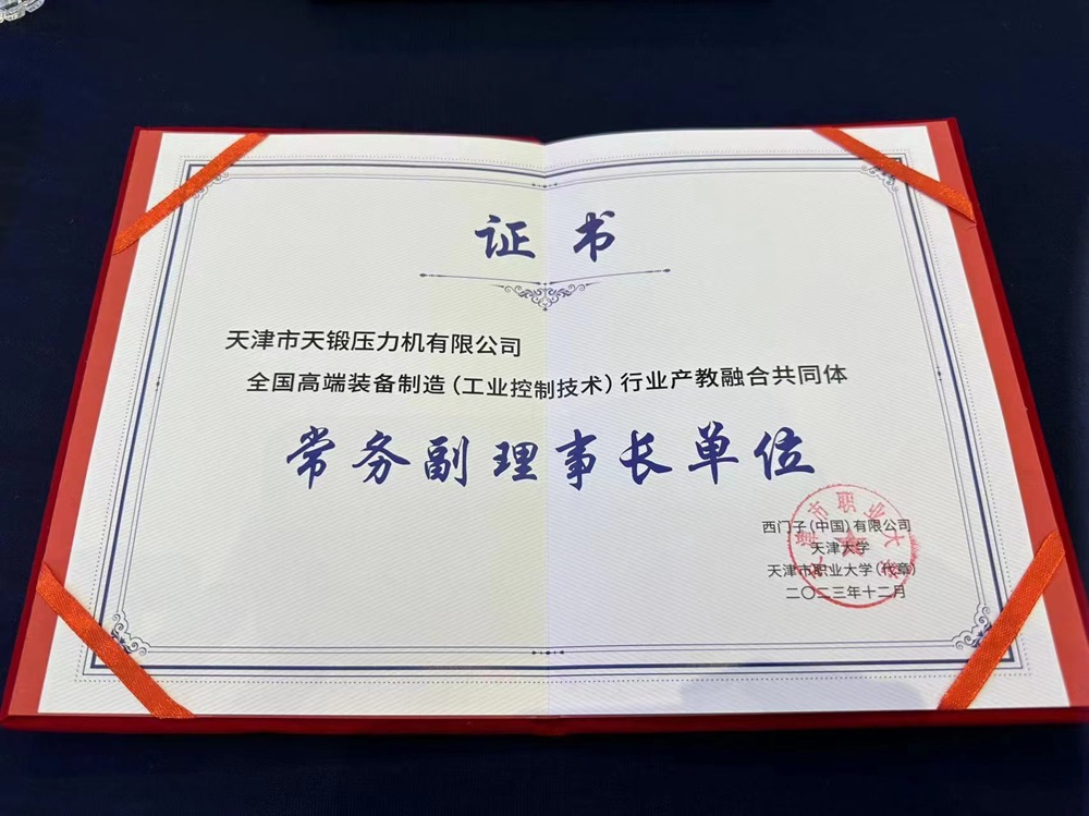 12月16日,全國(guó)首個(gè)高端裝備制造(工業(yè)控制技術(shù))行業(yè)產(chǎn)教融合共同體成立大會(huì)在天津召開。該共同體由西門子牽頭國(guó)內(nèi)200余家上下游企業(yè)、天津大學(xué)牽頭60余所本科高校、天津市職業(yè)大學(xué)牽頭100余所職業(yè)院校共同發(fā)起成立。天鍛公司當(dāng)選為該共同體常務(wù)副理事長(zhǎng)單位。