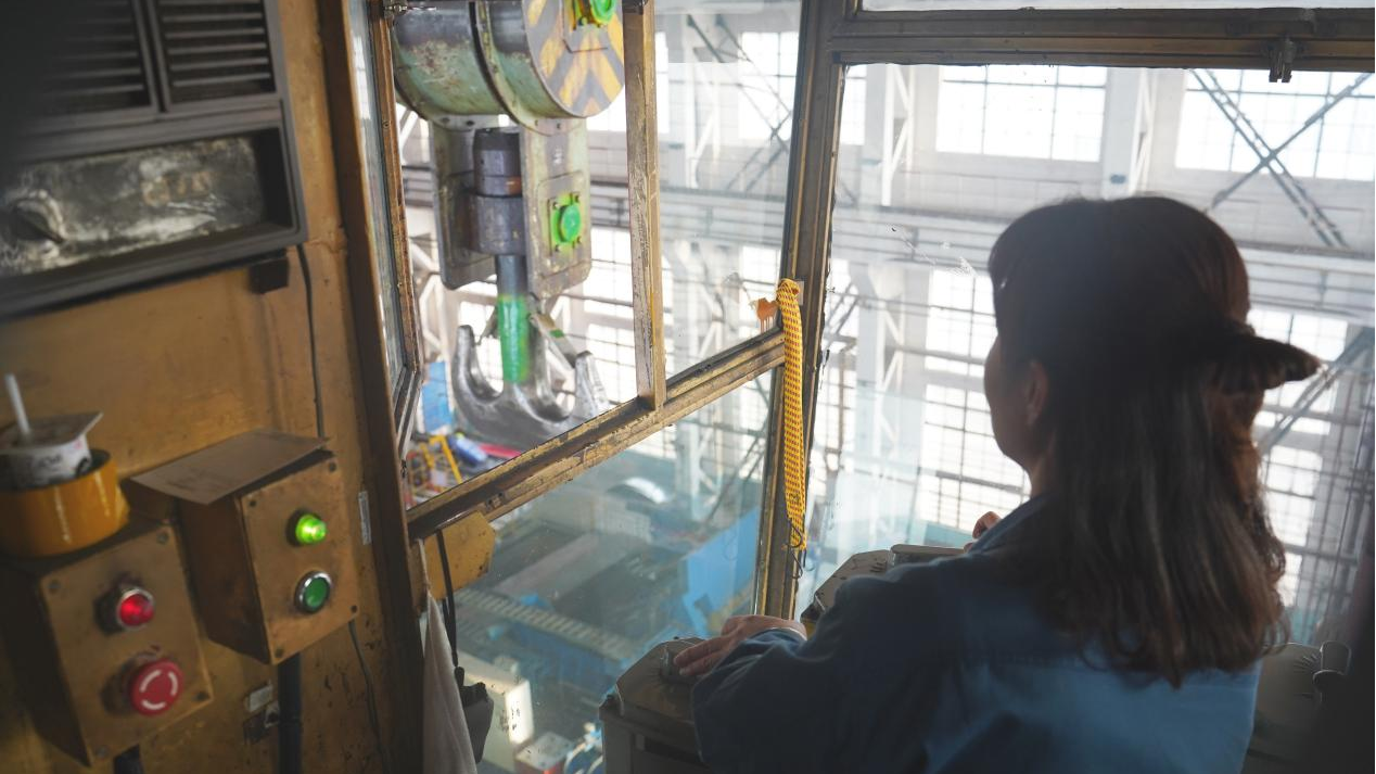 重裝車(chē)間高懸的“天車(chē)”駕駛艙內(nèi),駕駛員陳媚媚正全神貫注,借助對(duì)講機(jī)與地面人員的手勢(shì)信號(hào),上下、左右緩緩?fù)评僮鳁U,鐵鉤吊著幾十噸重的鍛壓部件左右移動(dòng),成功落在了作業(yè)地點(diǎn)。
