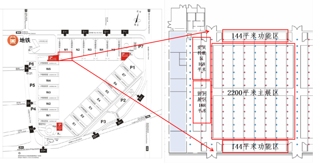 2)上海南站→博覽中心:乘坐地鐵1號(hào)線(xiàn)(富錦路方向),上海體育館站下車(chē),換乘地鐵4號(hào)線(xiàn)外圈,東安路站下車(chē),換乘地鐵7號(hào)線(xiàn)花木路站下車(chē),步行100米至博覽中心。