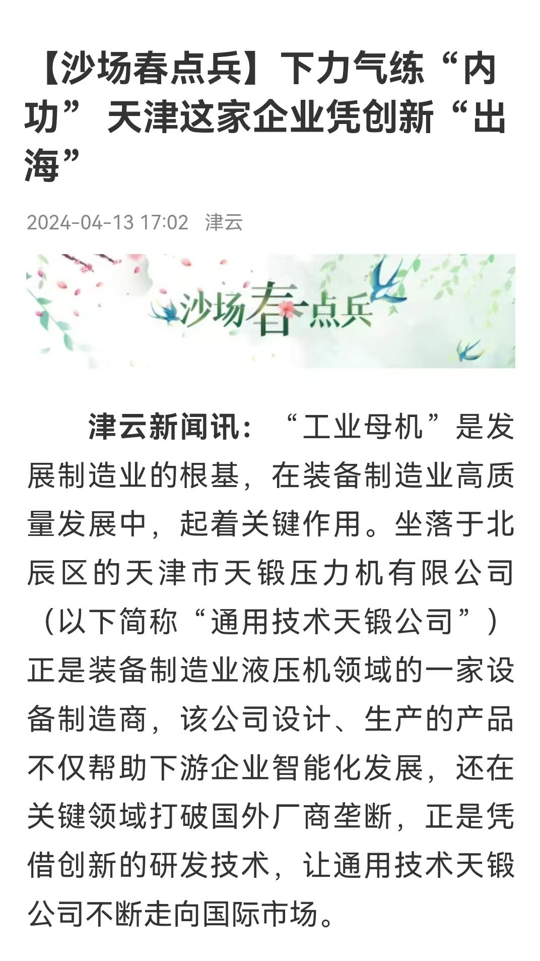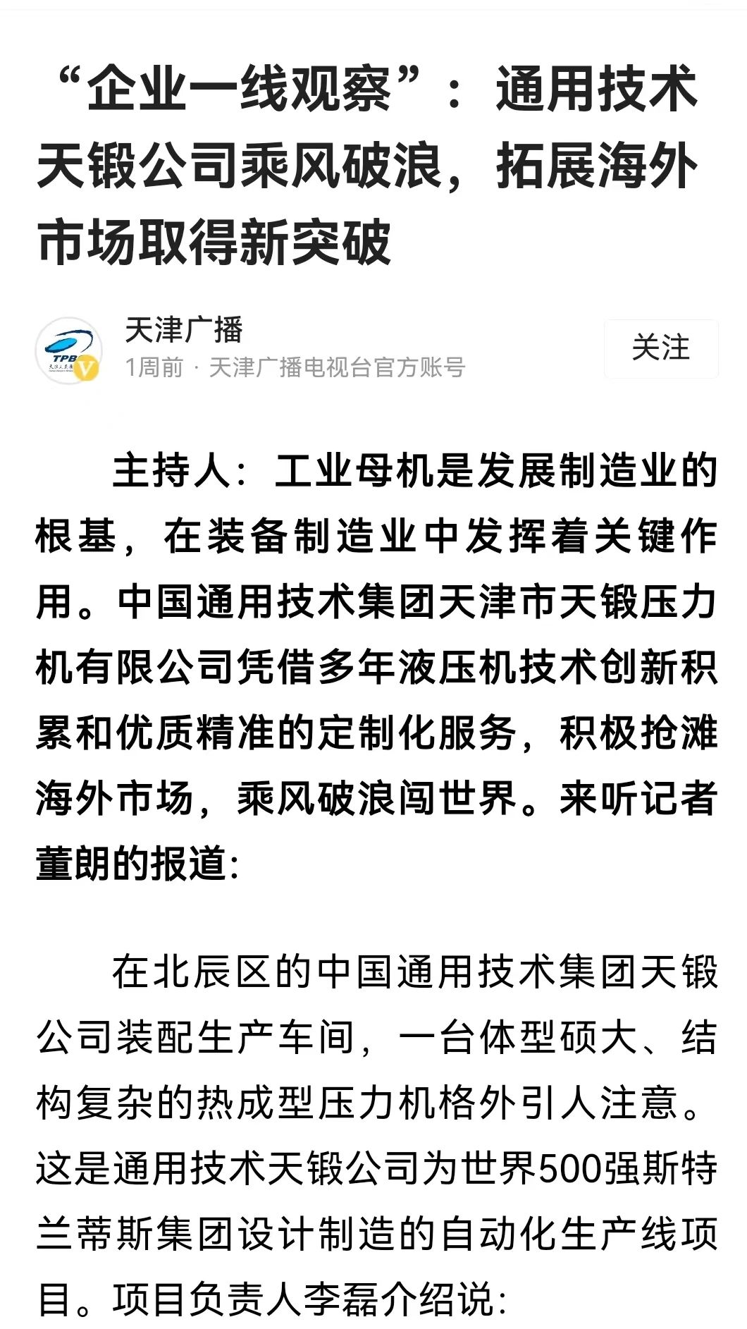 “工業(yè)母機(jī)是發(fā)展制造業(yè)的根基,在裝備制造業(yè)中發(fā)揮著關(guān)鍵作用。中國(guó)通用技術(shù)集團(tuán)天津市天鍛壓力機(jī)有限公司憑借多年液壓機(jī)技術(shù)創(chuàng)新積累和優(yōu)質(zhì)精準(zhǔn)的定制化服務(wù),積極搶灘海外市場(chǎng),乘風(fēng)破浪闖世界?!?